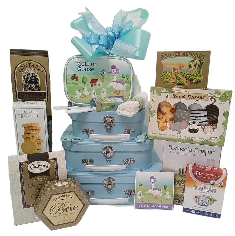 Three adorable suitcase style containers that make great decorative organizers in the nursery. They are filled with sweets and snacks for mom and dad to share and for the baby we have included a set of Safari Socks and a Mother Goose Grooming Kit imported from England. Perfect for a baby shower or new baby gift. can be hand delivered in San Diego or shipped nation wide. Items of equal or greater value may be substituted depending on availability and the discovery of great new products. Call to arrange a custom designed baby basket.