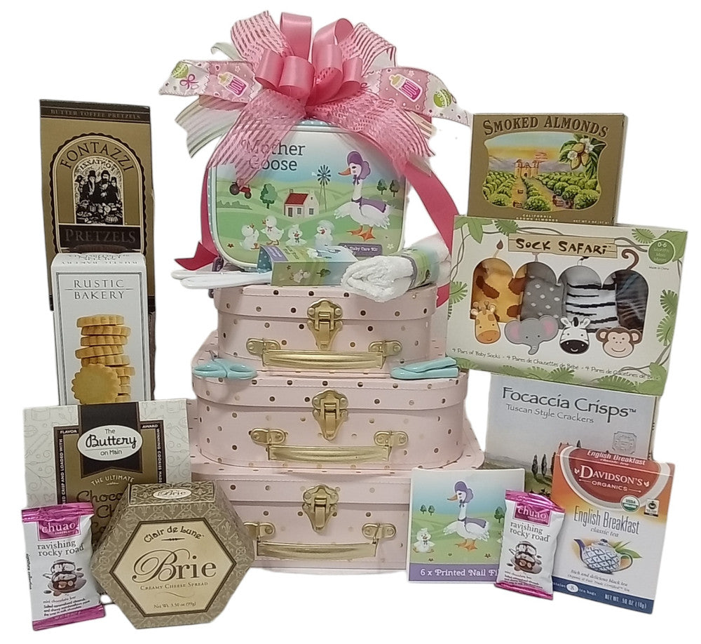Three adorable suitcase style containers that make great decorative organizers in the nursery. They are filled with sweets and snacks for mom and dad to share and for the baby we have included a set of Safari Socks and a Mother Goose Grooming Kit imported from England. Items of equal or greater value may be substituted depending on availability and the discovery of great new products. Call to arrange a custom designed baby basket.