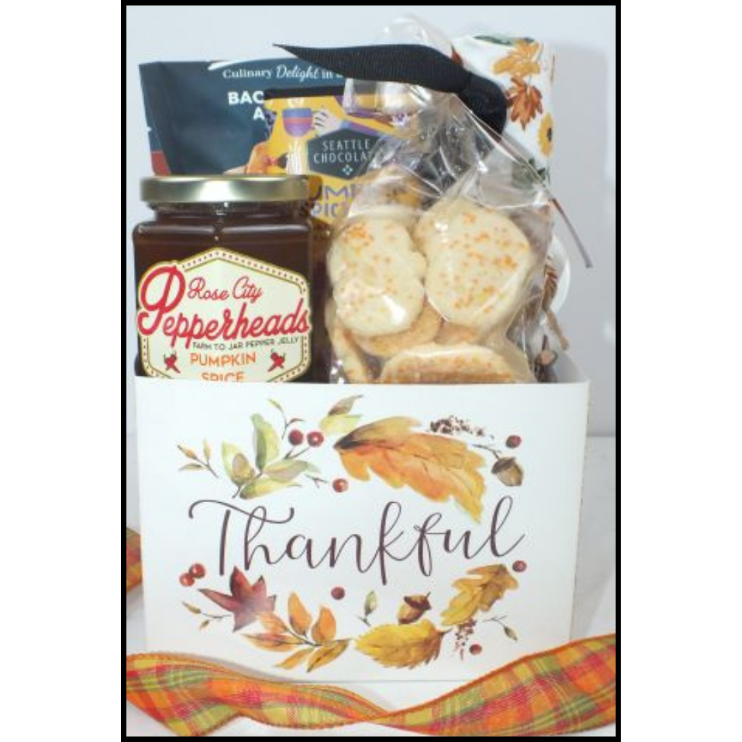 Designed in recyclable Fall themed basket box and wrapped in Cellophane with handmade bow.