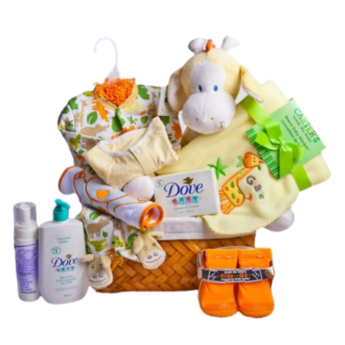 An adorable plush giraffe, matching embroidered blanket and giraffe-themed sleeper is a customer favourite. This irresistible ensemble is available in 3 versions: baby boy, girl or gender neutral. (Style of plush giraffe may vary).