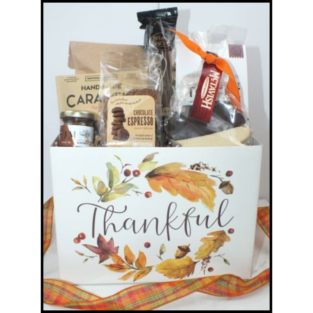 Designed in a fall theme container and hand made bow.