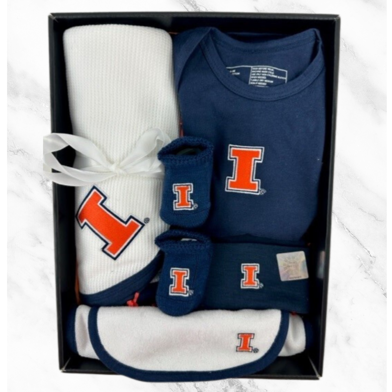Create a legacy with our University of Illinois Baby blue or orange newborn set. Authentic Illini gift set in Blue or Orange comes in a box shrink wrapped with a bow just in time to welcome a new Illini baby. Included are a new born onesy, receiving blanket, beanie, booties and a bib.