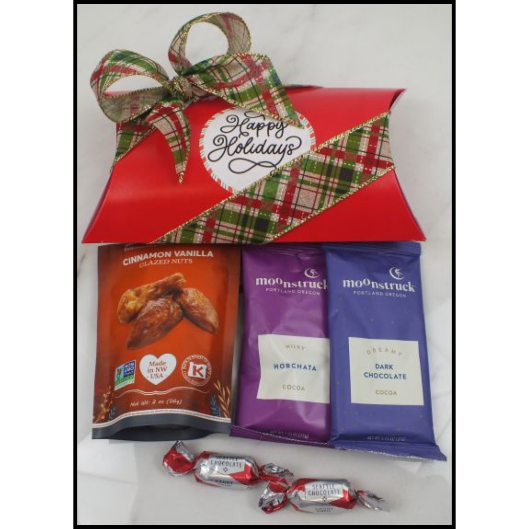 Designed in a red pillow pack with holiday ribbon. This gift can be personalized with your logo instead of our standard holiday label