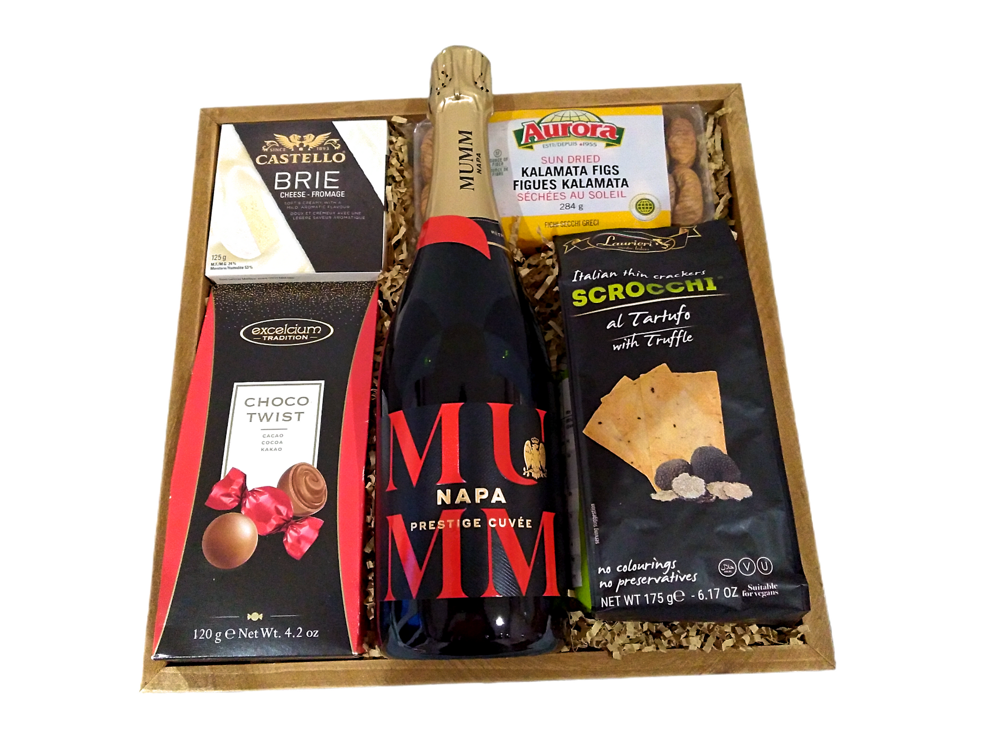 Includes: Castello Brie; Sun Dried Kalamata Figs; Excelsium Choco Twists; Italian 'Scrocchi' al Tartufo (Truffle) Thin Crackers; and bottle of Mumm Napa Prestige Cuvee. The natural wooden box comes shrink wrapped with a colourful bow. Cheers to a delightfully delicious experience!
