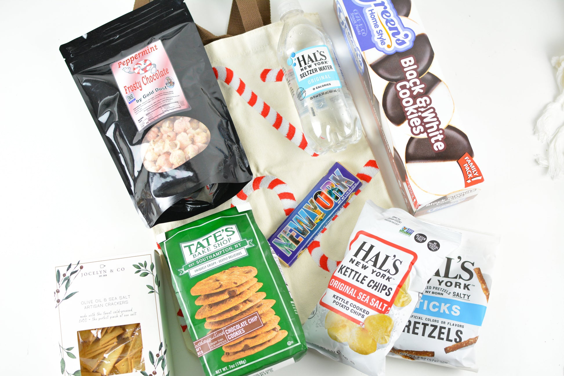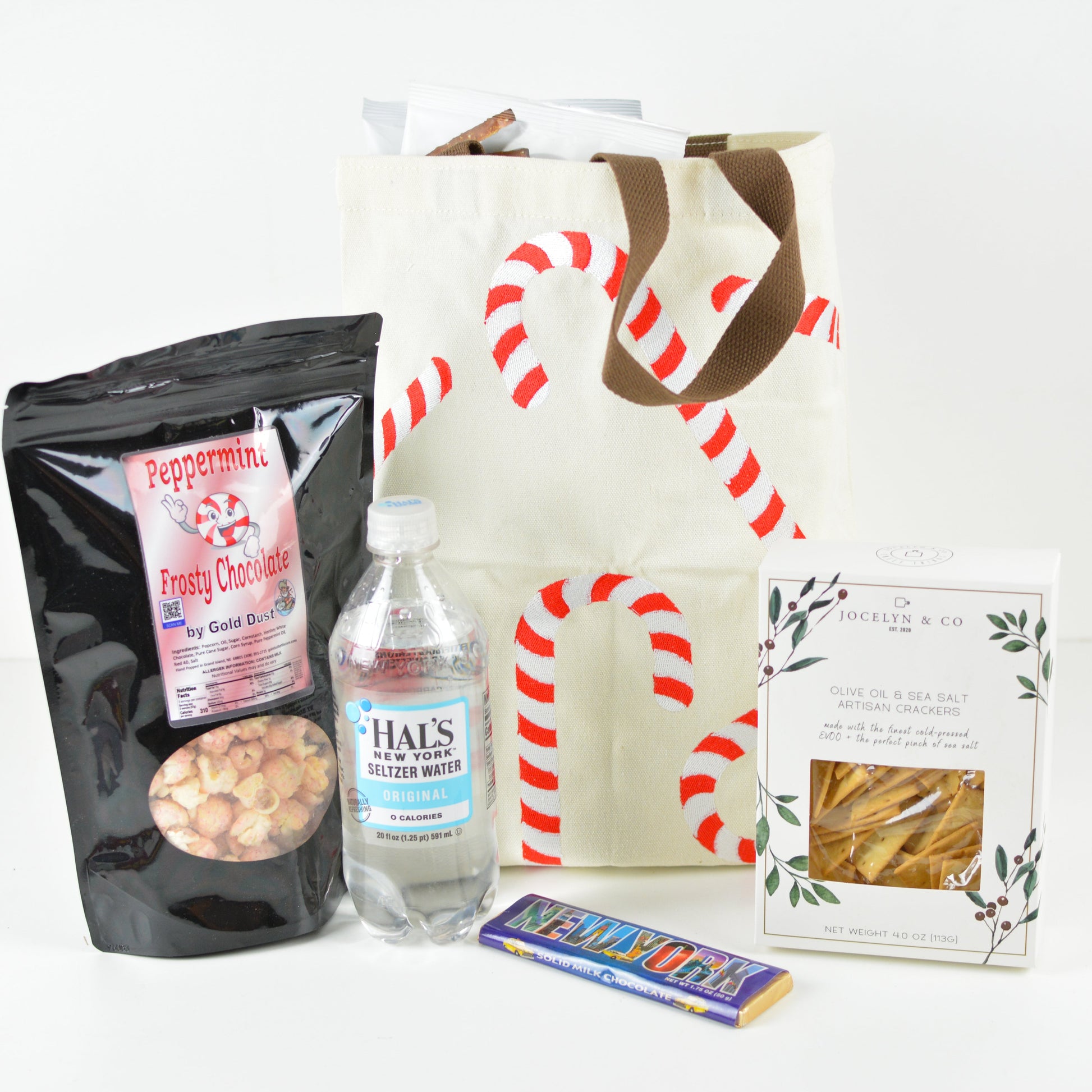 This delightful holiday gift presented in a charming candy cane tote bag is brimming with festive treats sure to spread cheer.