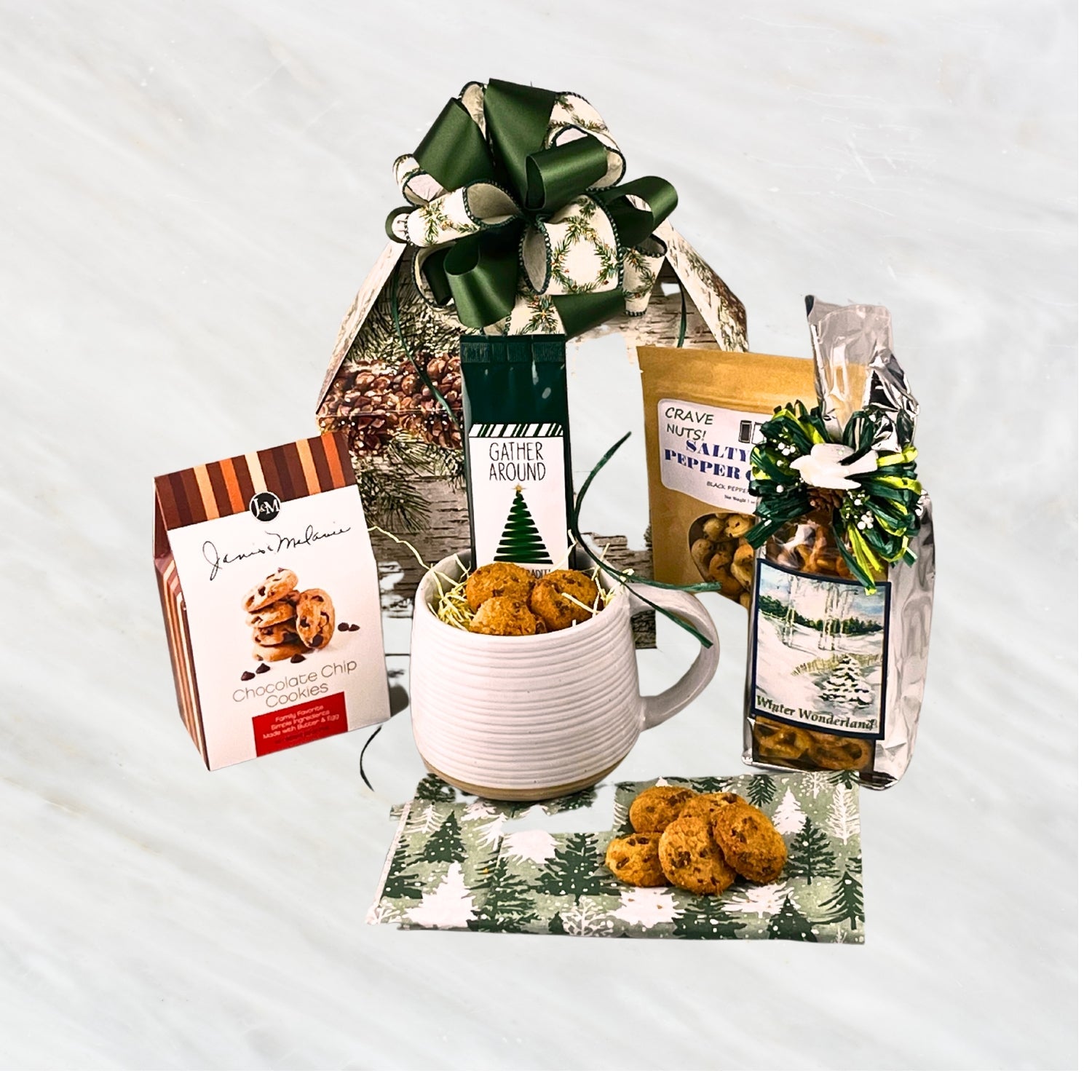 - Gourmet foods and mug are nestled in matching tissue, in a giftable gable box with hand tied bow and personalized message from you.