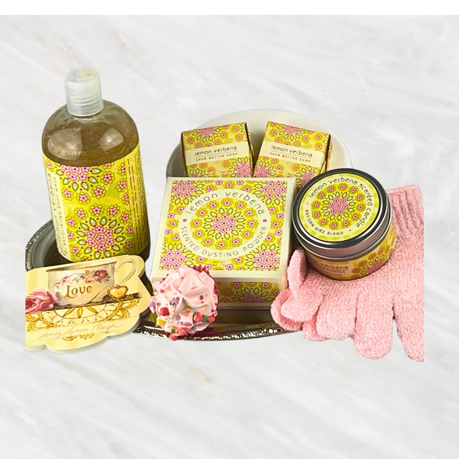 Indulge yourself in luxurious pampering with Simple Luxury's Lemon Verbena collection. Enjoy a relaxing soak with the cupcake bath bomb, pamper your skin with the body wash and exfoliating gloves, while enjoying the fragrance of this soothing Lemon Verbena candle.