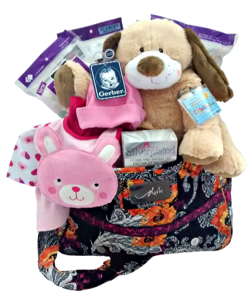 Contains an attractive diaper bag (styles vary), 3 piece outfit [available in 3 configurations: girl/boy/or gender neutral], matching cap, plush toy, silver plated comb and brush set, undershirts, crib sheets and diaper wipes.